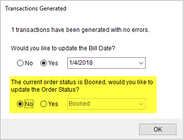 An option is presented to you when you Generate Transactions from within the Summary tab in Revenue Entry. With appropriate security access, you can also update the Order Status through the Transactions Generated dialog.