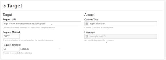 Place the upload request data in this section using appropriate format (JSON/XML). The following is portion of a lead request in JSON format. { "OrderNumber": { "MssOrderID": null, "XmlSystemDataTypeMapName": "Bob Order Information", "OrderSeg": null, "PSeg": null, "OSeg": null, "SSeg": null, "EstimateNo": null, "VanLineID": null, "ExternalID": "X1065612999", "GblNumber": null },...