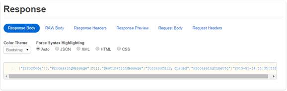 Returned is a MessageUploadResponse object in JSON or XML. Included in this object are the following properties. The object returned by the service request is either JSON or XML and include four properties including an ErrorCode value. “0” is a successful request.