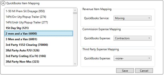 MoversSuite Administration > QuickBooks > QuickBooks Item Mapping