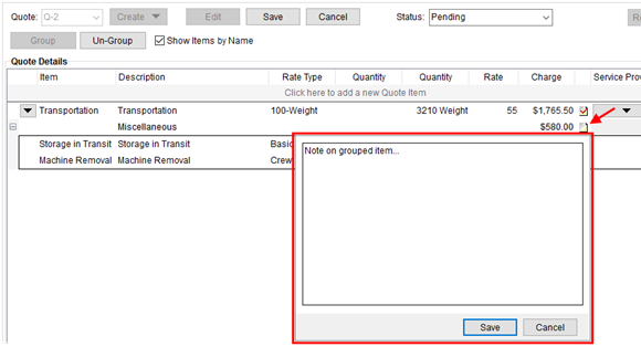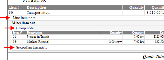 The purpose of the note is to provide information regarding the particular item or group to the customer. The note appears on the standard Quote Form provided by MoversSuite. The information on the note appears on the report at the detail line level and within the group level.