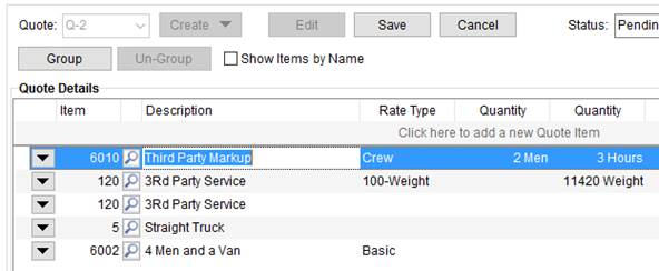 When all the data is established, press the Tab or down arrow button to save the quote item.