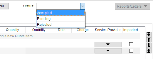 Status Set the status of the quote to one of the following defined for your organization through Claim Status Setup. The default status of a newly created template is “Pending.” If you duplicate a quote through the Quote from Current option, the status defaults to “Copy.” Quotes with a status of “Accepted” are available to Revenue Import in Revenue Entry. |