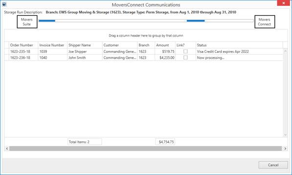 The first is the MoversConnect Communications screen. This screen provides details and the progress on the invoices being processed, specifically Electronic Payments and Online Payments.