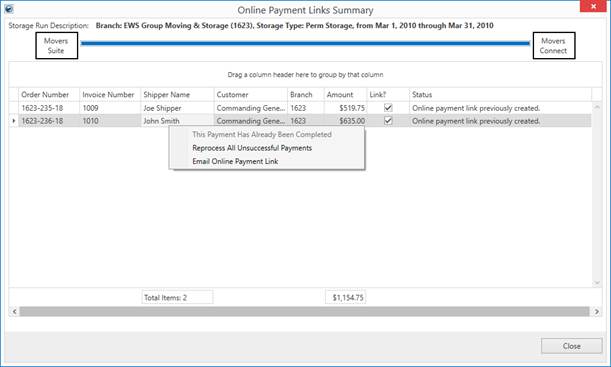If Online Payments are included in the billing run, then an Online Payment Links Summary screen also appears. Similar to the Recurring Payment Processing screen, options included within this screen include the ability to reprocess any unsuccessful payments and resend an email with the payment link.
