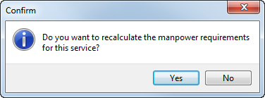 When making changes to the CPU counts through this option and Save is pressed, the application prompts you to recalculate the manpower for the service.