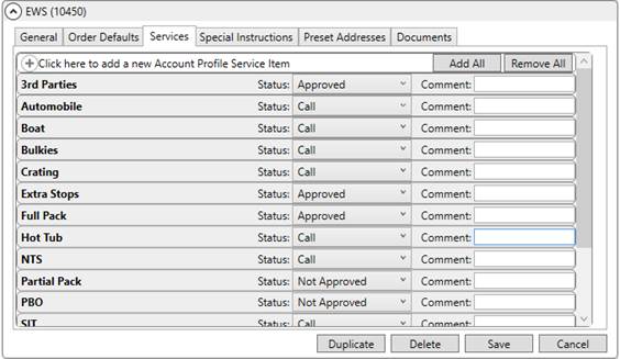 Once services are defined, they automatically show on the Service tab for all Account Profile Setup records. From this setup, you can select the default Status value and provide any comments needed for the service.