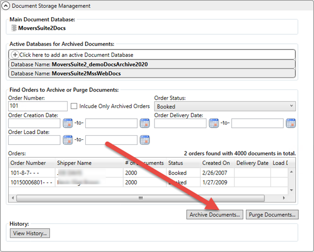 The View History button opens the Document Archive/Purge History screen showing you the details of all recent archives and purges.