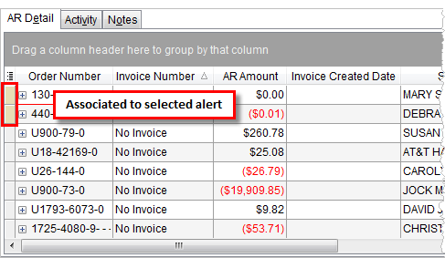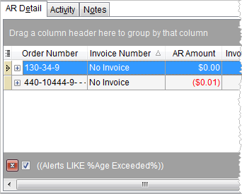 Selecting this option causes the application to display only records associated to a selected alert within the AR Detail section. The Custom Filter in use displays at the bottom of the AR Detail data grid.