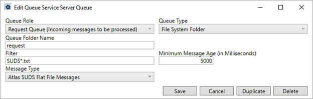 Establish a queue service for the Atlas SUDS Flat File Download within Queue Service Server Setup. This record defines the process and the folders referenced for XML files. Provide the specified options to enable the Atlas queue service.