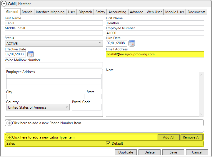 Setup area: MoversSuite Administration > Personnel > Personnel