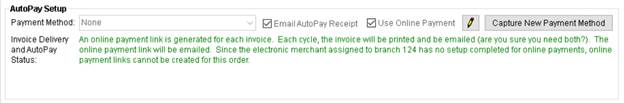 Use the AutoPay Setup section in Payment Setup tab to select a Payment Method from those established for the order to enable automatic payment for the billing record. Selecting a payment method instructs the application to process payments for the storage run automatically.