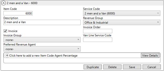 The Item Code is the source of revenue that the commission is based on. It is referenced as the Service setting when adding or editing revenue through the Add Revenue Item screen and as the Rate Item within the Add Revenue Group screen. The Item Code is also referenced for commissions generated through Import Actuals and Revenue Import processes.