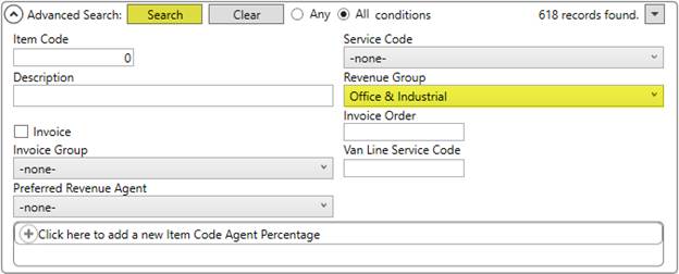 You may find it valuable to list Item Code Setup records by their associated Revenue Group to make the list more manageable. You can search by a specific Revenue Group as illustrated in the example below (Figure 15).