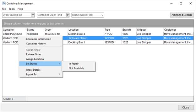 The Container Management screen allows you to view and manage containers within MoversSuite. This includes the ability to assign and release containers from orders, modify the status of container, create reports of container tracking, and more.