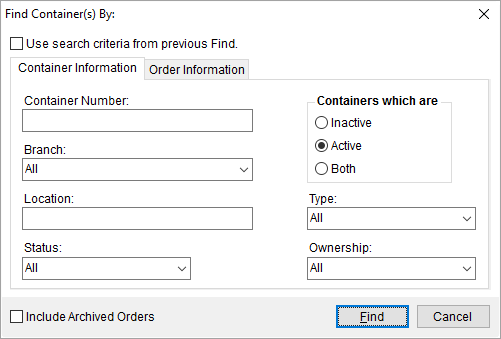 This Find allows you to start with all active and available containers and allows you to filter by entering or selecting values in one or more fields from two different tabs. The fields available to you are documented in the following topics: