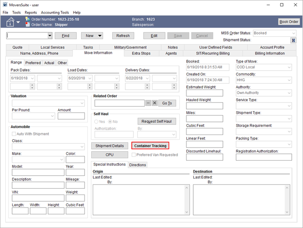 It is also available on an order through the Container Tracking button on the Move Information tab.