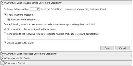 Use this setup to provide warnings to users when setting or changing the customer to one that has a potentially poor credit standing with your organization. This setup also allows you to prevent the customer from being assigned, optionally send an email to the collector assigned to the customer or to other designated recipients, and options to create an order note regarding the warning.