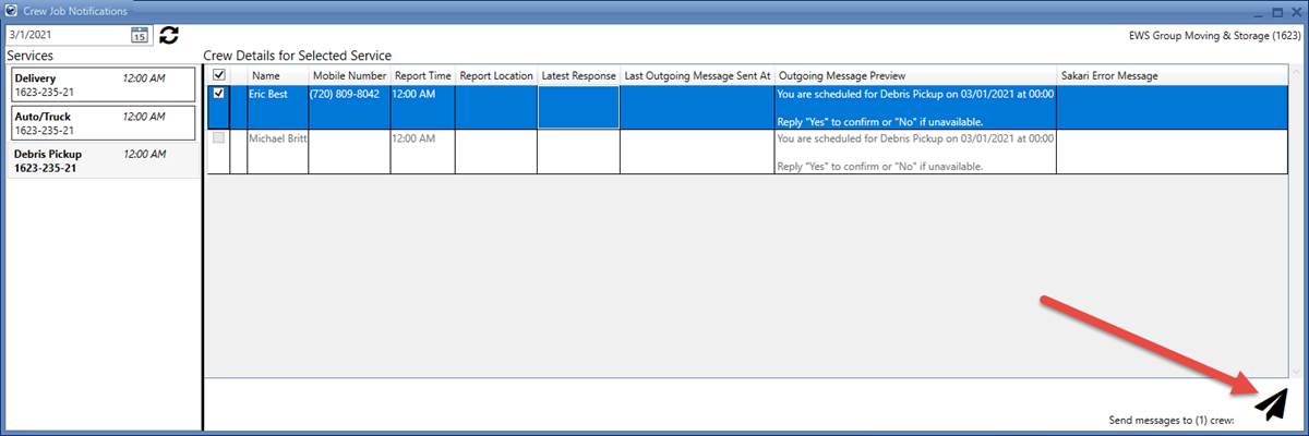 To view the pane, select a service from the Crew Job Notifications screen. The table populates with all prior information fed to it from the Local Services module and you can check mark each crew member to whom you want to send a message.