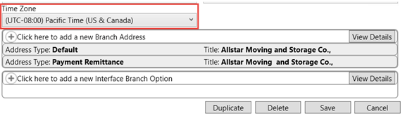 To add the time punches through the Add Punches screen in the MoversSuite application, a Time Zone must be affiliated to the branch in the Branch Setup. To do so, simply select a Time Zone from the Time Zone drop down menu right above the Branch Address in Branch Setup and press Save.