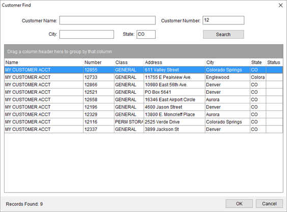 You can enter partial values in any or all fields and the application returns matching records. In the above example (Figure 25: Customer Find), the application returns all records that start with a Customer Number of “12” and located in the State of Colorado (CO).