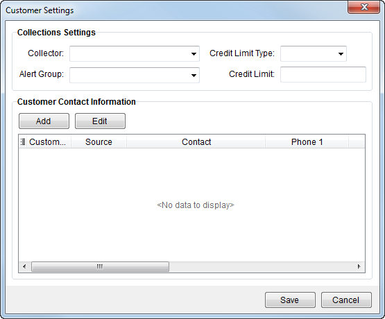 Collection managers have access to the Customer Settings functionality where they can assign a collector and alert group to a customer as well as update credit limit and contact information.