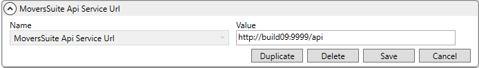 Verify that the MoversSuite Api Service Url is defined with a Value that references the URL pointing to the MoversSuite API Service.