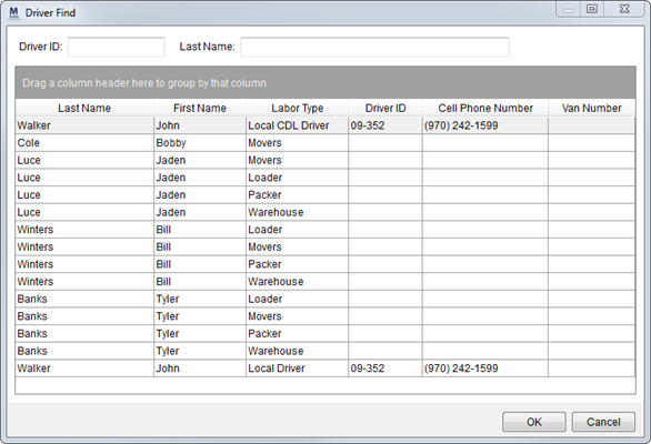 The following data displays in the Driver Find window. All data is pulled from the driver Personnel Setup record.
