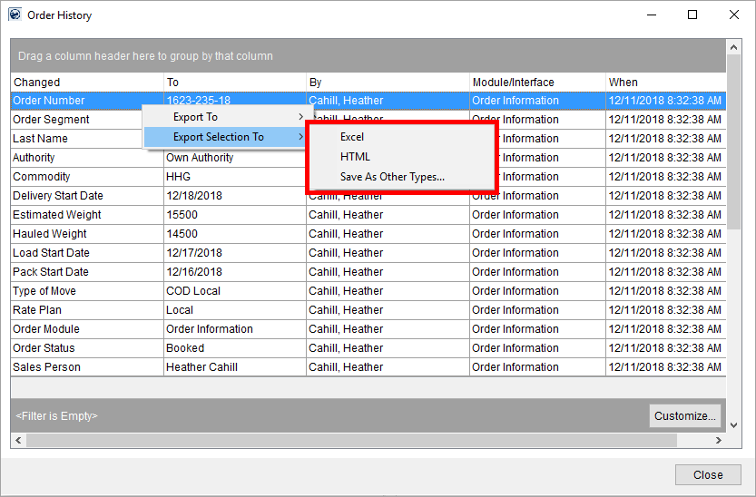 The Export Selection To option is the same as the Export To option but allowing you to send grid data for just the selected records to an export format of your choice. Once you select one or more records and choose Export Selection To, you are prompted to save the file as a specific type through the Save Grid to File screen.
