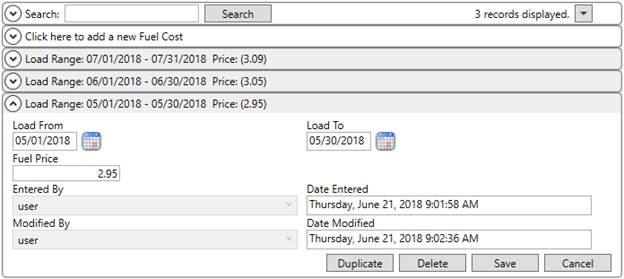 Utilize the Fuel Cost Setup to establish fuel prices referenced to compute a Fuel Surcharge. Refer to the Fuel Surcharge topic for more information including setup examples.