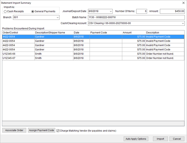 If the file is formatted and saved correctly, then the Statement Import Summary screen appears. From this screen, you can correct any payment codes, change or set the order, update the Import Auto Apply Options, and more.