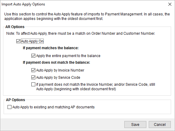 You can control the behavior of auto applying of batch items through the Import Auto Apply Options screen. Refer to the Import Auto Apply Options topic for details.