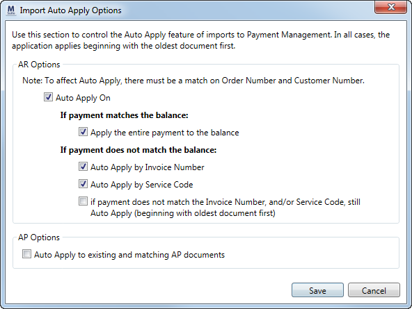 Check this option to auto apply revenue (AR) items imported into Payment Application. When checked, all other AR options listed underneath it are available. When this option is unchecked, the application does not auto apply the import; all items will need to be manually applied.