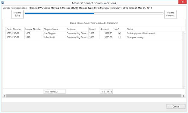 The MoversConnect Communications screen appears when messages are sent to the MoversConnect system as part of a mass sending of information, such as during a Recurring Billing Generation run. It monitors the progress and records errors through the Status column.