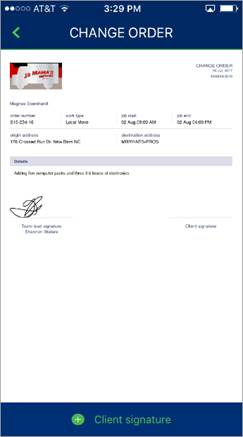 You can generate a Change Order request from the Info section within MSCrew. This function produces a formatted document that includes your company logo, service information, your requested changes, along with signature capture of the lead and client. The output of the Change Order is a generated PDF document that is stored within the Document Management system and optionally is attached to an email message. The document is also available through the Documents tab within the mobile application.