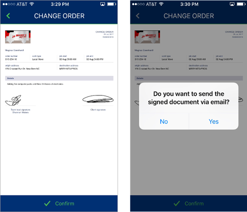 Pressing Confirm opens a prompt to send the document in attached email. The application stores a copy of the document as a PDF attached to the order within the Document Management system.