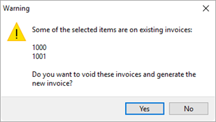 If you attempt to generate an invoice when one or more items you have on the newer invoice also exist on a generated invoice, then the application prompts you to void the previous invoice or invoices.