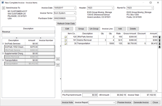 The New Complete Invoice screen provides you with the ability to generate an invoice based on order revenue from sources such as that created through the Transactions tab and imported from Local Services, from Quote records, from various Rating Import items, and more. You also have the ability to create ad hoc line items, create groups of line items, and arrange the groups and items as desired.