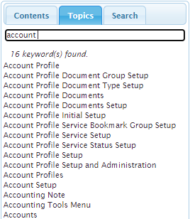 Use the Search pane to locate a topic by one or more keywords. The search lists all topics that contain the specified keyword(s) and lists in the order of those topics with the most occurrence at the top of the list.