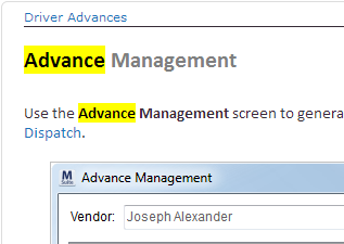 These buttons allow you to move to the next or previous topic in sequence as it relates to the topic currently being viewed. If on a top-level topic, such as Driver Advances, pressing the Next button () takes you to the Advance Management topic and then the Add/Edit Advance topic, etc.