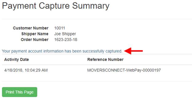 Once a payment capture is successful through the Online Payment site, then this summary page displays. It provides information on whether the payment capture was successful or not along with an option to print the information.