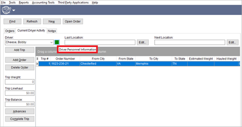 In Long Distance Dispatch, it is available by clicking on the safety indicator icon within the Current Driver Activity tab. In Figure 75, the safety indicator icon is green. By hovering your cursor over this button, Driver Personnel Information will briefly appear as a hint.