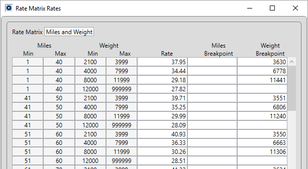 Figure 30: Rate Matrix option for the Miles and Weight record