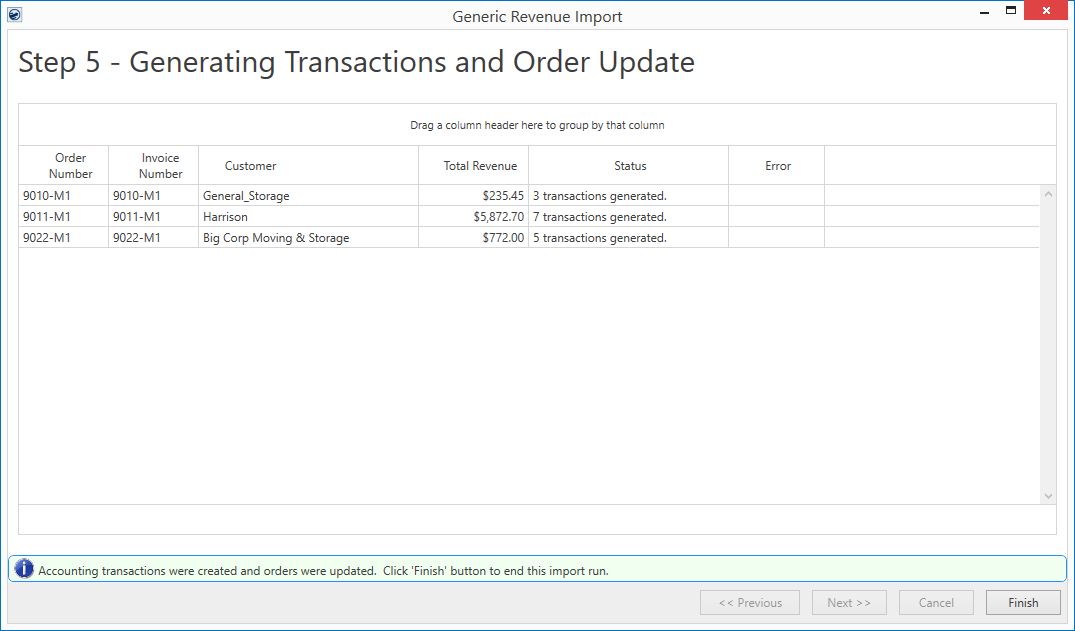If all transactions generate without errors, then the Finish button is enabled and can pressed to close out of the window.