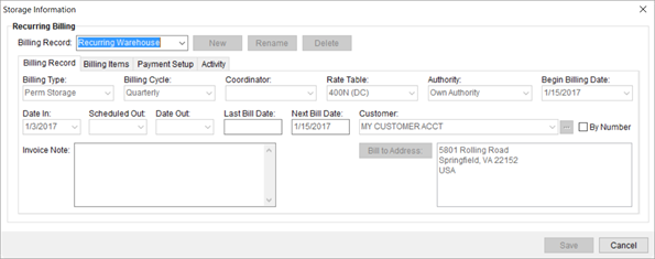 The Storage Information dialog displays read-only information pertaining to the Recurring Billing record set on the order. This dialog is available by pressing Storage Information within the Order Details screen and through the Recurring Billing function within the Order Details (Office & Industrial) screen.