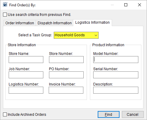 A Task Group is a subset of a Task Definition (also set in Name, Address, Phone, Contacts and Locations, and Claim Detail) and aids in filtering search results by its assignment to an order, i.e. Task Group is a category within a Task Definition. See Logistics Information Search Criteria for more information.