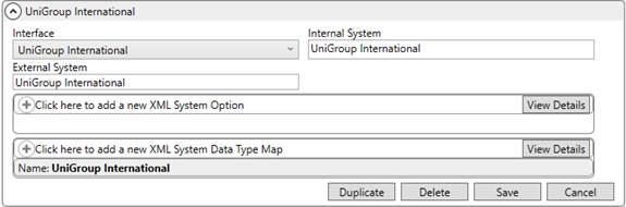 Establish an XML System Setup record for the UniGroup International Interface. Establish Internal System and External System settings with the same name.