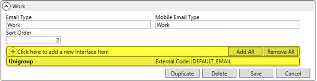 To support exchange of multiple shipper email addresses, users need to setup an external code in the Shipper Email Type Setup. For that purpose, while defining a Shipper Email Type Setup record, attach an interface item of ‘UniGroup’ with the external code ‘DEFAULT_EMAIL’.