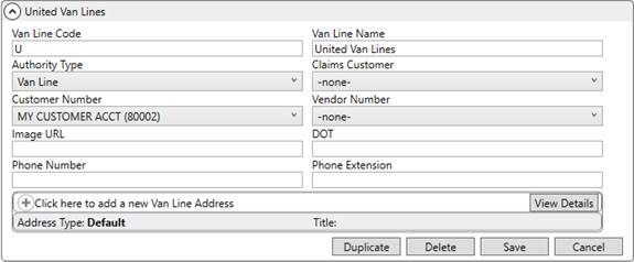 Establish a Van Line Setup record for United Van Lines. This record must have an Authority Type of Van Line and is referenced by the following setup areas: