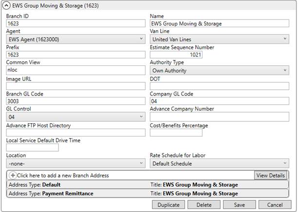 Establish records to support UniGroup International. For these records, the Agent, Van Line, and Authority Type must be set on the order and the Agent must be a Sister Agent. Further, the Authority Type, Branch, and Van Line must also link to a XML Interface Setup record (refer to the XML Interface Setup instructions below).
